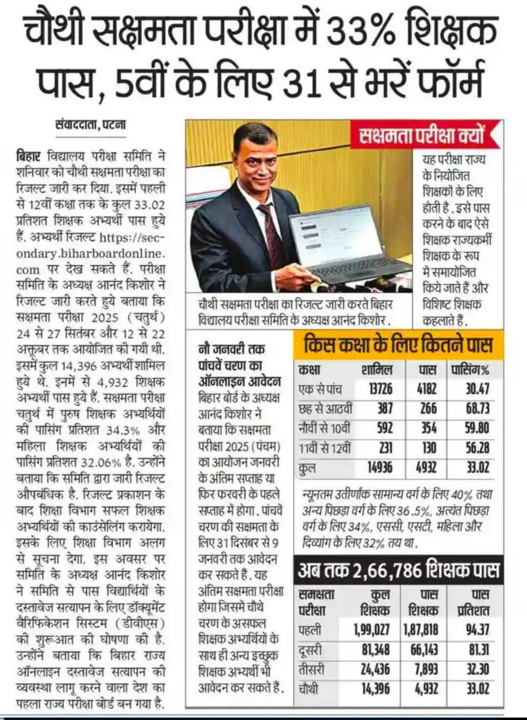 بہار اساتذہ اہلیت امتحان (सक्षमता परीक्षा) کے چوتھے مرحلے کا نتیجہ جاری کر دیا گیا ہے، جس میں 33.02 فیصد امیدوار کامیاب قرار پائے ہیں۔ یہ امتحان ریاست کے سرکاری اسکولوں میں مقامی نکائے کے تحت کام کرنے والے اساتذہ کی اہلیت جانچنے کے لیے منعقد کیا گیا تھا۔